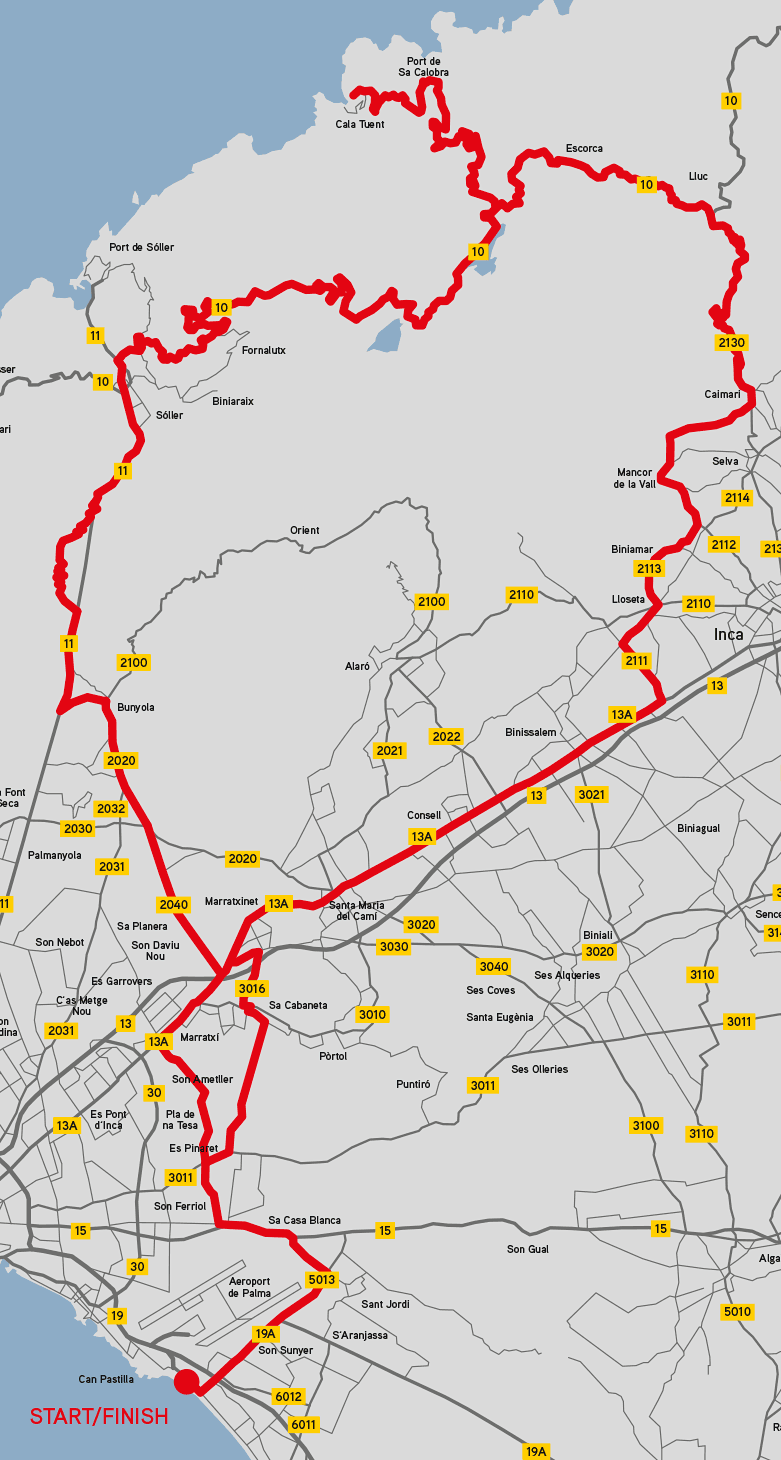 In the initial 40 kilometers go through the inland to Inca. The beginning of the route has only a few slight uphills. It will warm you up for the long climbs. The first more difficult part starts from Selva and finishes at the Lluc monastery. It is a long climb through a pine forest, but it has a short, more relaxing passage in the middle. You will then climb to the pass above Sa Calobra. 11 kilometer serpentine descent to the Sa Calobra Bay will follow afterwards. We recommend paying more attention here to safety, due to higher traffic. You can have a coffee stop at Sa Calobra Bay, then the most challenging part will follow. First, you will ascend the serpentines back to the pass above Sa Calobra, to a height of 720 m above sea level. Then you will do a short, easy part, leading to another, about 8 km climb with the beautiful view of lakes around. Next part will be 15-kilometer downhill in the Tramuntana Mountains to the Sollér. You will then climb to the Col de Sollér. That climb will be the last challenge of the day. It will then be followed by a slight descent back to the final destination in Can Pastilla.