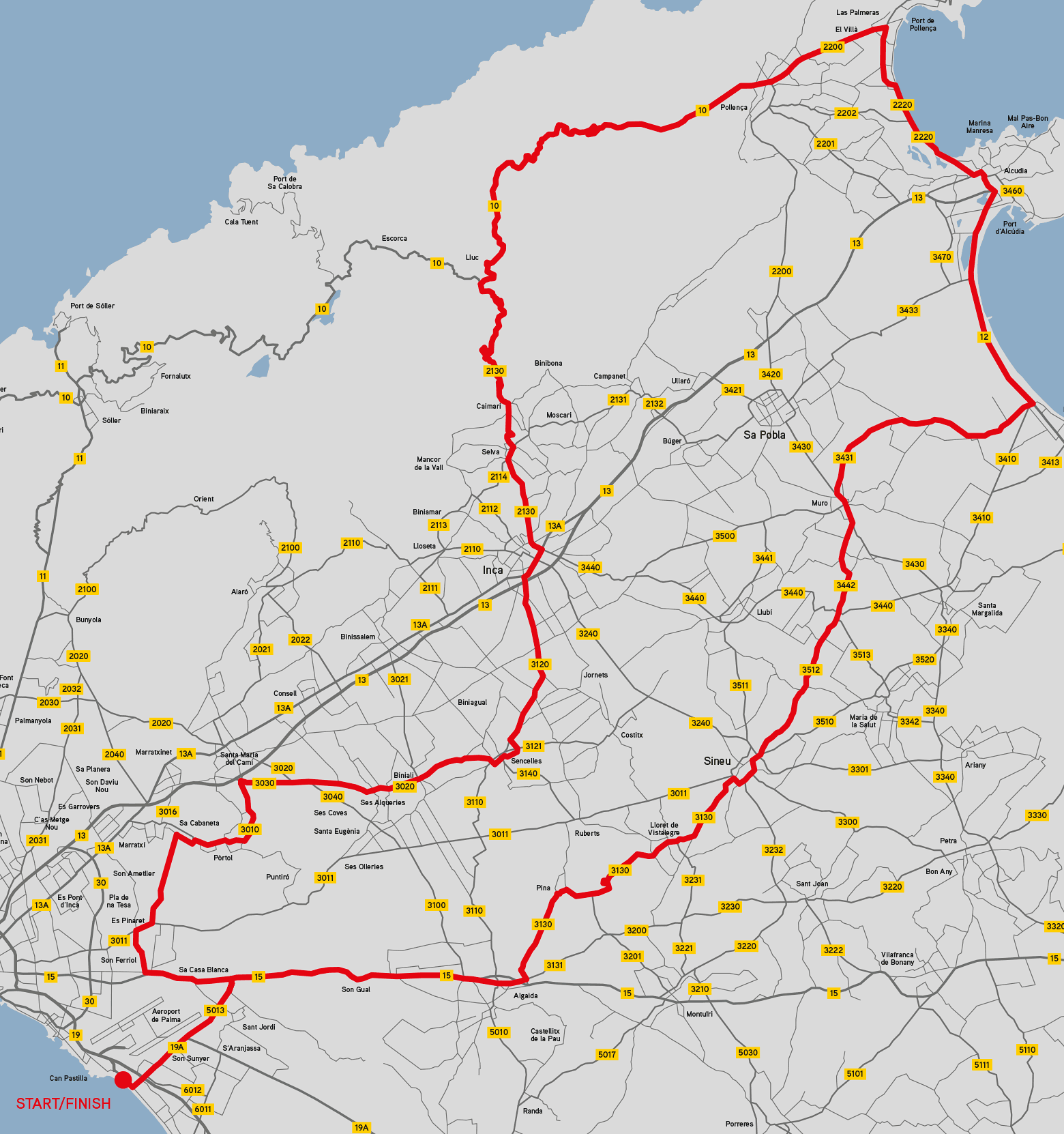 Start i cíl této trasy je v místě Palma Aquarium. Trasa do severní části ostrova, cestou se zdolává pohoří v severní části ostrova přes jeden z nejvyšších přístupných vrcholů na ostrově (569 m/m), zpět přes krásné pláže v oblasti Port de Pollenca a Can Picafort. Vnitrozemská cesta zpět přes tradiční místa jako Sineu a Algaida.