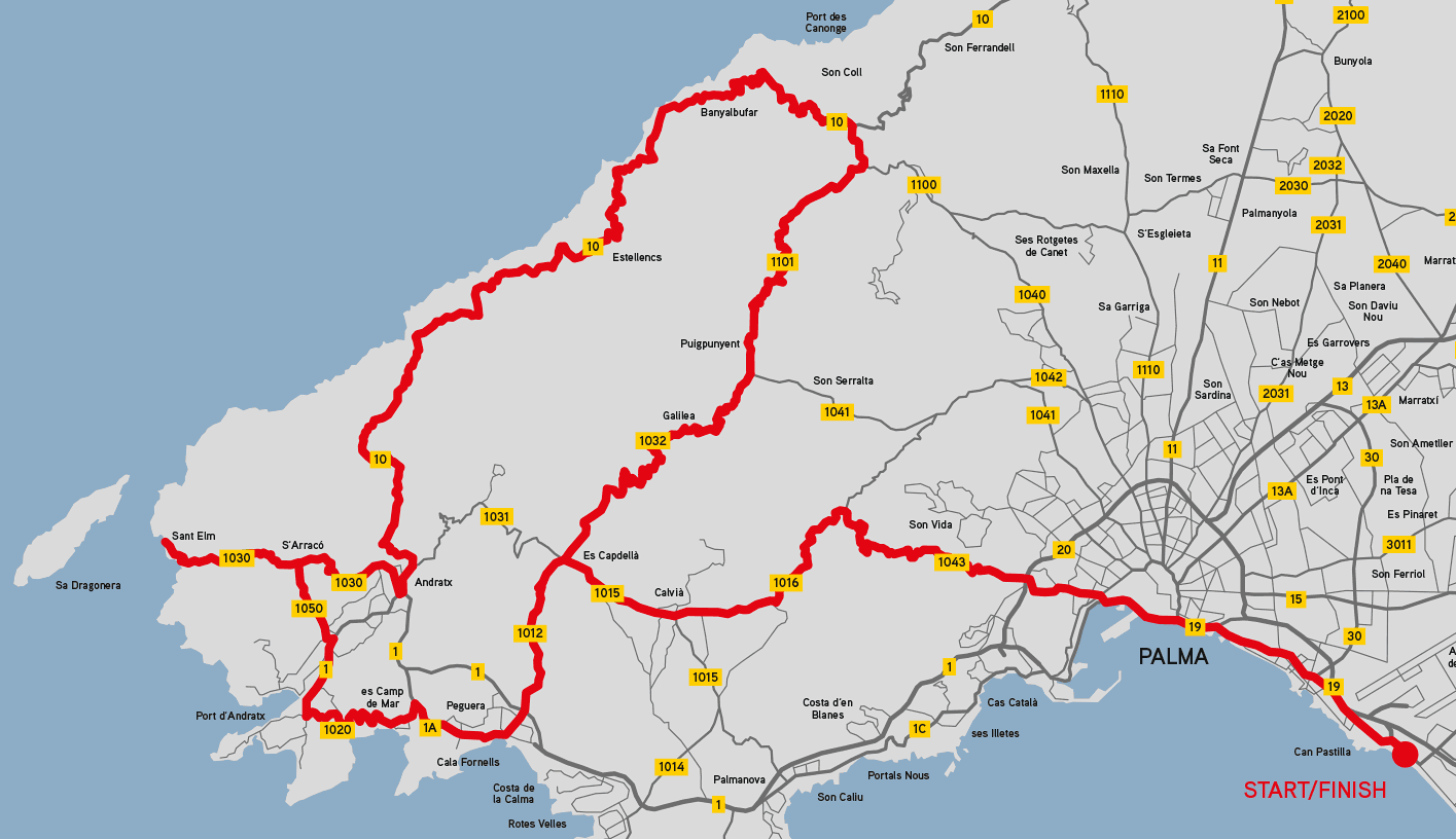 Po úvodních 10 kilometrech vedoucích přes město Palma Vás čeká zhruba 6 kilometrové stoupání na vrchol Coll Sa Creu, které jako by vystihovalo tuto hornatou etapu. Z vrcholu Coll Sa Creu vede příjemný sjezd k městečku Calviá, který se však po pár kilometrech opět změní ve stoupání v úchvatné přírodě pohoří Tramuntana. Následující kilometry pokračují v podobném duchu a řadou po sobě jdoucích několika kilometrových stoupání a následných klesání se dostanete přes městečka Galilea a Puigpunyent k jihozápadnímu pobřeží ostrova, při kterém Vás čeká řada dech beroucích výhledů na členité pobřeží v kombinaci s nádhernou přírodou pohoří Tramuntana. Odpočinkovější pasáž Vás čeká zhruba na 80 kilometru, kdy začíná klesání k jihozápadnímu cípu ostrova u městečka Andraxt. Zvlněný terén kolem jižního pobřeží vyústí k opětovnému výšlapu na vrchol Coll Sa Creu v opačném směru, z kterého lze očekávat delší sjezd zpět k Palmě.